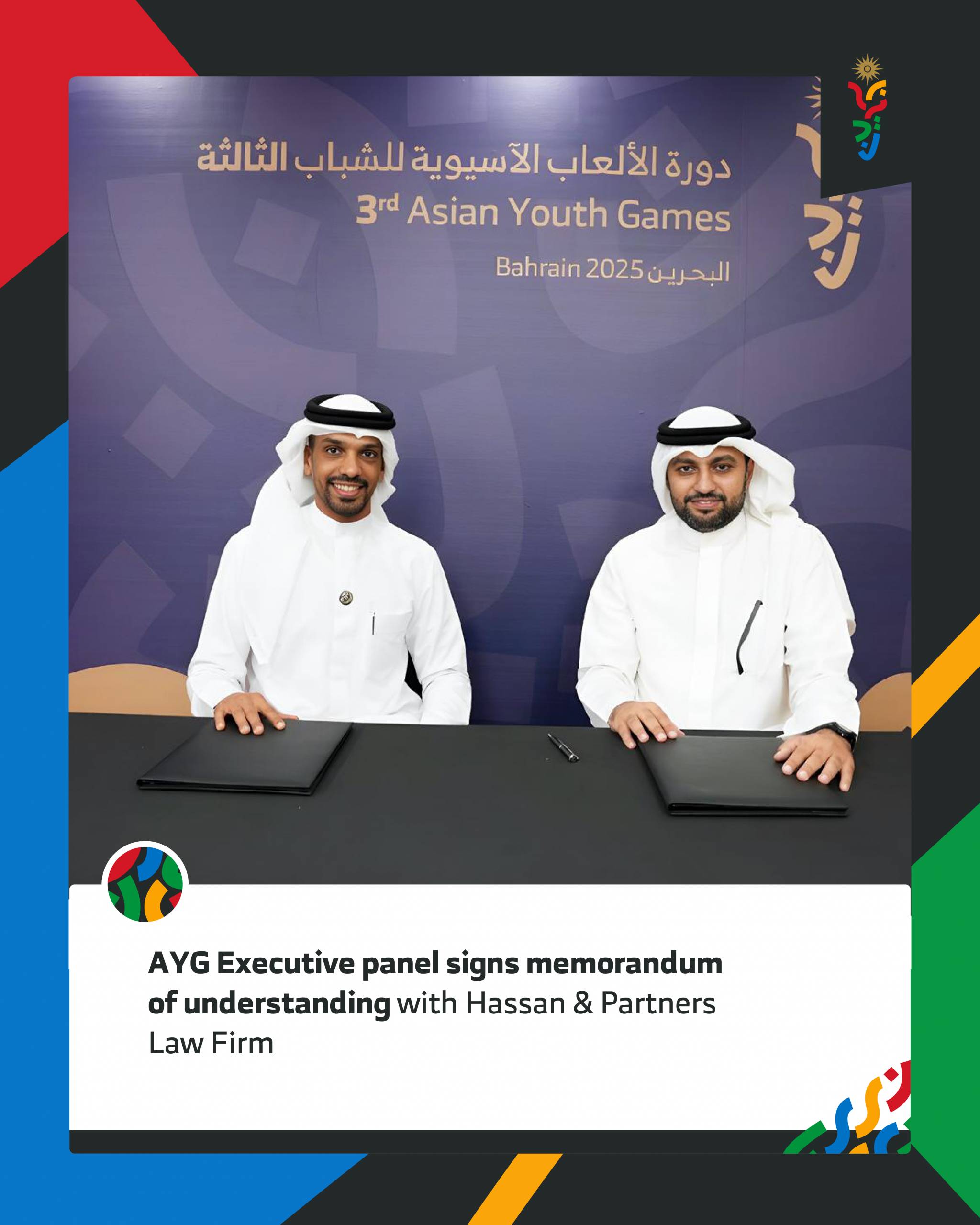 On this occasion, Mr. Duaij stated, “In light of our national role in successfully hosting the Games and showcasing the culture of Bahrain as a leading platform for continental sporting events, we are pleased to sign this memorandum with Hassan & Partners to provide legal advice for the committee’s operations. This collaboration will help establish the legal frameworks necessary to ensure our success and the execution of all agreements and contracts in accordance with approved legal guidelines.”